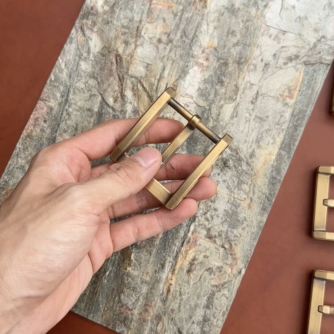These solid brass buckles are artistically machined with a CNC milling machine. Carefully designed geometries are articulated with its unique textures and patina finishes, which introduces a timeless rustic aesthetic to these buckles.