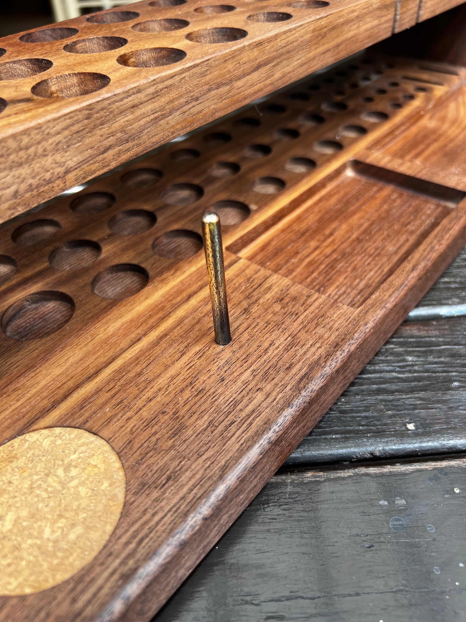 Exquisitely crafted from North American Walnut with a fine balance between precision machining and traditional woodworking finesse. These racks are made to impress, and also to be useful too. The extended platform enables easy storage and accessibility to frequently used tools and threads.