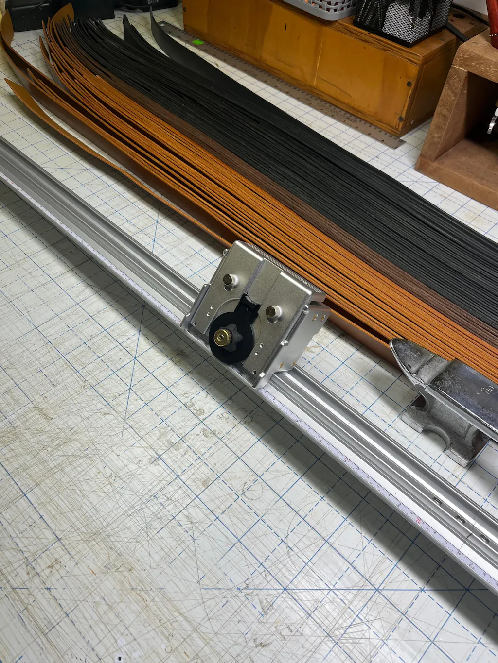 This concept of this tool roots from woodworking guided rail saws. I threw this idea to a a friend (who happens to be a leather tool designer and a machinist) a little over two years ago, and at long last our collaborative effort came into fruition!